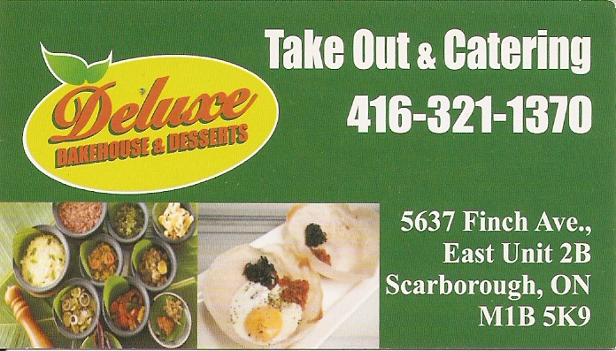 Deluxe Bakehouse & Desserts5637 Finch Avenue East Unit # 2B Scarborough Ontario M1B 5K9 Canada 416 321 13702017-03-14 19:14:48Takeout & Catering, Sri Lankan & Indian Foods, Rolls, Patties, String Hoppers, Bread, Roti, Dosai