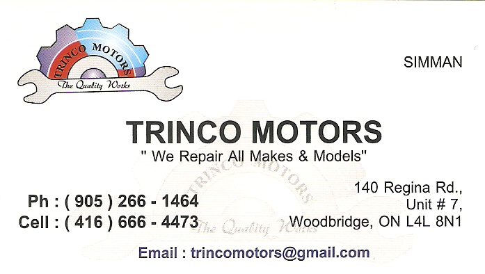 Trinco Motors140 Regina Road, Unit # 7 Woodbridge Ontario L4L 8N1 Canada 905 266 1464416 666 4473 testtrincomotors@gmail.com2017-03-18 12:14:24We Repair All Makes & Models